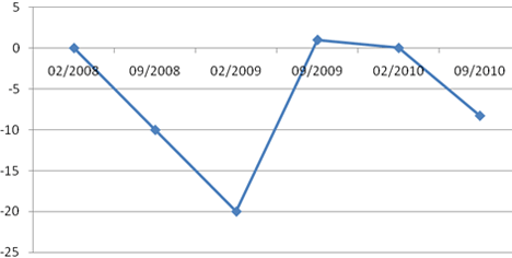 De Reynaers bouwbarometer, krijgt dus een flinke klap na het herstel 1 jaar geleden. De halfjaarlijkse barometer maakte in de aanloop van de economische crisis, in de herfst van 2008, nog een forse duik naar beneden met 10 punten om zes maanden later, in februari 2009, nog eens met 10 punten te dalen. In september jl steeg de barometer echter spectaculair met 21 punten om in februari van dit jaar te stabiliseren op het niveau van februari 2008. Deze klim wordt afgebroken door de terugval met 8 punten.