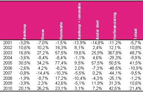 In aantal en in bedrag werd er respectievelijk een stijging opgetekend van 21,4% en 23,7% t.o.v. 2009. Van het totaal aantal kredieten werd 12,8% verleend voor de nieuwbouw van een woning en werd 31,1% toegekend voor de renovatie van een woning.