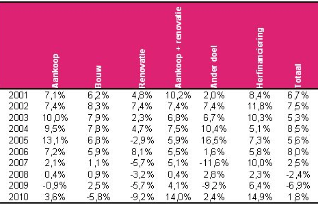 In Tabel 1 wordt getoond dat de groei van het aantal hypothecaire kredieten (uitgezonderd herfinanciering) het grootst is voor de nieuwbouw van woningen, wat wijst op een duidelijke herneming van deze activiteit in 2010.