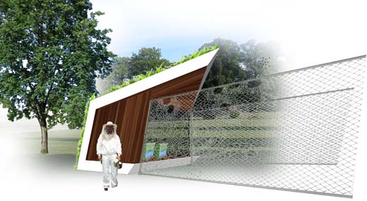 Het bijenonderkomen is volledig gebouwd van natuurlijke en ecologische materialen, ingepakt in en door groen. De scherpe daklijn biedt schaduw, bescherming en begeleidt de uitvliegende bijen. Het glas geeft een blik op de kasten, je kan zien hoe de bijen drinken en hoe de imker zijn werk doet. Het hekwerk zorgt ervoor dat de bijen hoog uitvliegen en beschermt de kasten tegen honden en kinderen en andersom natuurlijk. Binnen het hekwerk, in de groenwand en op en aan het bijenpaleis zelf worden de eerste inheemse drachtplanten geplaatst, om de bij in actie te zien en voor de eerste voeding voor de bijen.