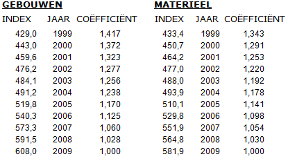 De indexstijging voor het materieel bedraagt 3,0%. De omvangrijke prijsstijgingen in de energiesector en voor produkten in de metallurgiesector, die zich gedurende de eerste drie kwartalen fors doorzetten, kenden vanaf het begin van het laatste kwartaal een zeer sterke daling waardoor de globale stijging –over het gehele jaar genomen- afgezwakt werd. Hoewel van minder doorslaggevend belang werden –op jaarbasis– dezelfde trends waargenomen op het vlak van vervoerskosten. Ook de loonkosten stegen nationaal op jaarbasis met ruim 3%. Bijgevolg –en in weerwil van de huidige conjunctuur- noteren we voor 2008 een verdere stijging van de index materieel t.o.v. de voorgaande jaren.