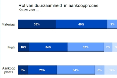 Er is nagegaan welke rol duurzaamheid speelt voor een drietal aspecten, te weten: materiaalkeuze, merkkeuze en de keuze voor de aankoopplaats. In totaal vindt vier op de vijf personen (79%) werkzaam in de bouw- en installatiewereld duurzame materialen belangrijk. Een derde (33%) van alle partijen geeft zelfs aan dat duurzaamheid een zeer belangrijke rol speelt in de keuze voor het materiaal. De rol van duurzaamheid is bij de keuze voor een merk of aankoopplaats ook niet te verwaarlozen. Zo speelt duurzaamheid bij bijna de helft (44%) een (zeer) belangrijke rol als men een merk moet kiezen. Bij de keuze voor een aankoopplaats zegt 34% duurzaamheid een belangrijk aspect te vinden.