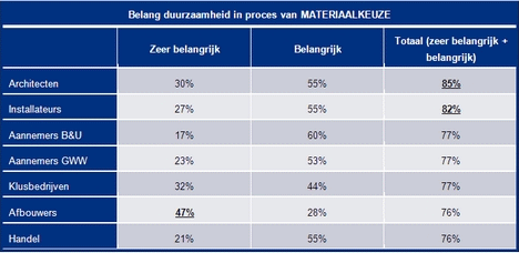 Vooral architecten en installateurs hechten veel belang aan de rol van duurzaamheid in de materiaalkeuze, gezien het feit dat respectievelijk 85% en 82% aangeeft dit (zeer) belangrijk te vinden. Verder valt onder afbouwers op, dat bijna de helft (47%) duurzaamheid zeer belangrijk vindt in de materiaalkeuze. Bovendien geeft meer dan de helft van deze partij (54%) aan dat de rol van duurzaamheid (zeer) belangrijk is in hun merkkeuze. Ook voor bijna de helft van de klusbedrijven (48%) en aannemers GWW (47%) is duurzaamheid een (zeer) belangrijk aspect om in overweging te nemen bij de keuze voor een merk.