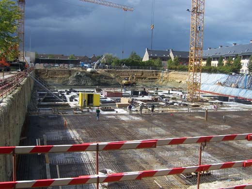 De voorbereidende werken, zoals het omleggen van de bestaande riolering en nutsleidingen, werden in maart afgerond. Hierna werd gestart met de afbraak van het voormalige zwembad. Heel wat aarde werd verzet bij het uitgraven van de ondergrondse parking. Deze werken nemen enkele maanden in beslag. Ondertussen zijn de werken al in die mate gevorderd dat de ‘eerste steen’ officiëel ingehuldigd kon worden door burgemeester Frans Peeters en de projectpartners.
