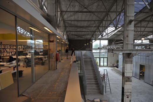 In de 1200 m2 grote ongeklimatiseerde hal zelf zijn een aantal overleg- en vergaderplekken ondergebracht, maar ook een restaurant, een klein auditorium en er staan enkele bomen. Constructief wordt het dragende vermogen van de oude loods volledig benut. De nieuwe onderdelen zijn zo licht geconstrueerd dat ze direct op de bestaande bedrijfsvloer geplaatst konden worden, zonder extra fundering. Ook zijn delen van de nieuwbouw aan de oude kraanbaan gehangen.