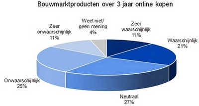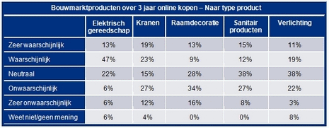 Van de consumenten die zich in 2010 online hebben georiënteerd op de aanschaf van elektrisch gereedschap, geeft 60% aan over 3 jaar (zeer) waarschijnlijk online elektrisch gereedschap te kopen. De consumenten verwachten ook een stijging voor de online verkoop van kranen (42%), verlichting (30%), sanitair producten (27%) en raamdecoratie (22%), maar de geschatte toename in de online verkoop van elektrisch gereedschap is veruit het grootst.