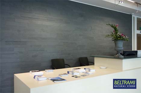 Deze grijsgroene Braziliaanse leisteen oogt heel natuurlijk en is door zijn natuurruwe oppervlak uiterst geschikt voor druk belopen ruimtes. Door te kiezen voor BELTRALINEA strips kon de architect zijn creativiteit volledig laten gelden. Daarom werden de strips zowel op de vloer als op de wanden toegepast.