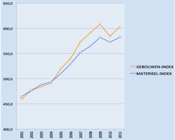 Hiertoe wordt de jaarlijkse evolutie van een aantal parameters opgevolgd, met name de prijzen voor grondstoffen en materialen, halffabricaten, machinecomponenten, intermodale transportkosten (nationaal en internationaal), loonkosten, wisselkoersen en invoerrechten die allemaal samen in een gewogen percentage worden verwerkt tot een eindcijfer dat representatief is voor het materieel waarmee men in de praktijk in de Belux wordt geconfronteerd. Nog meer dan voor de INDEX-GEBOUWEN is de staalprijs dé bepalende factor, die na de eerder forse daling in 2009, een evenzo forse stijging in 2010 kende. Ook hier heeft de bescheiden stijging van de loonkosten de totale stijging van de INDEX-MATERIEEL ingeperkt.