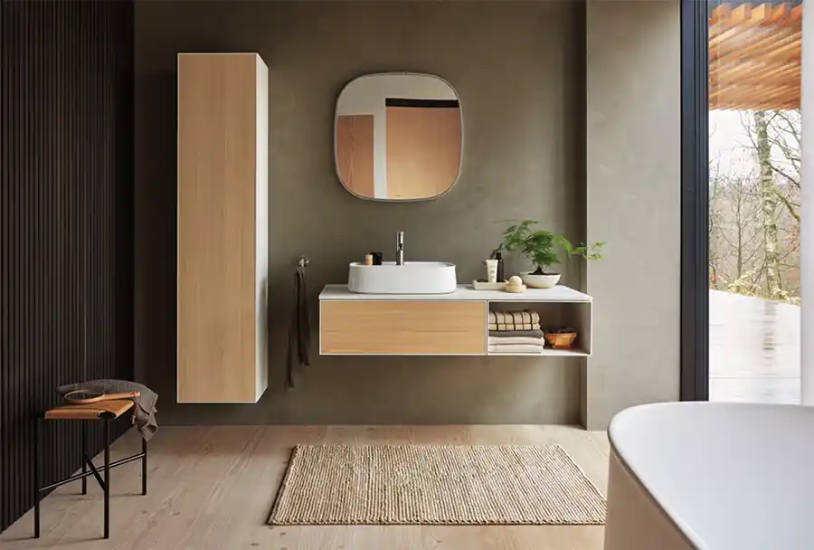 Hangende meubels zijn vandaag populair omdat ze het onderhoud vergemakkelijken: de vloer blijft vrij om te dweilen of te stofzuigen. Maar technisch vraagt dat om extra bescherming tegen vocht. De wastafel is vaak het koudste element in de badkamer. Wanneer stoom ontstaat, vormt condens zich op het oppervlak. Druppels lopen af en kunnen achter of tegen het meubel terechtkomen. Zonder bescherming kan vocht binnendringen in de kern van MDF of HDF. Dat leidt op termijn tot zwelling, barsten en structurele schade."Uitsparingen rond de wastafel en andere kritieke zones worden bij meubels van Duravit extra beschermd tegen vocht. Daarnaast testen we onze meubels in Duitsland in een speciale unit waar we 100% luchtvochtigheid en stoom simuleren, meerdere dagen lang. Ook de achterzijde is verstevigd met een 8 mm houten paneel en er blijft bewust ruimte tussen meubel en muur om de vochtimpact te beperken", verklaart Steve Souverijns, After Sales & Marketing Manager bij Duravit Belux. "Die technische kwaliteit wordt ondersteund door een standaard fabrieksgarantie van vijf jaar op onze meubels. Bovendien werken we uitsluitend met PEFC-gecertificeerd hout uit duurzaam beheerde bossen en ondersteunen we natuurbehoud in het Zwarte Woud."