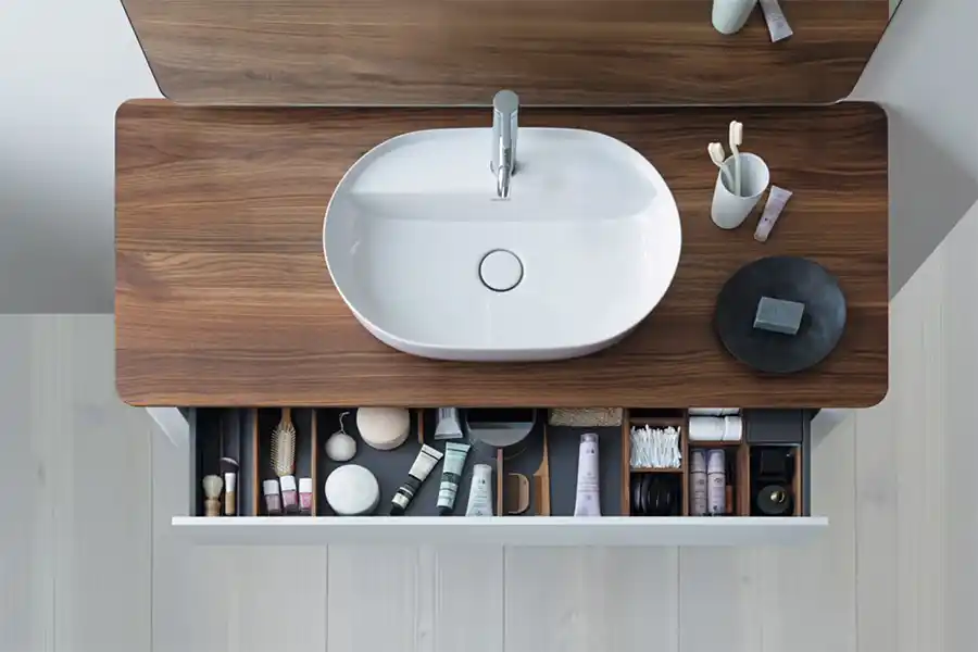 De trend richting compacter wonen heeft een directe impact op badkamerinrichting. Minder diepe meubelvarianten en efficiënte standaardformaten worden belangrijker, zeker wanneer de beschikbare ruimte beperkt is. Ook opbergruimte blijft een belangrijk aandachtspunt: een badkamer moet voldoende plaats bieden voor handdoeken, verzorgingsproducten en voorraad, zonder dat de ruimte overvol aanvoelt."Wij zien dat minder diepe meubels steeds relevanter worden, omdat badkamers tegenwoordig niet groter worden", concludeert Steve Souverijns. "Voor Belgen is opbergruimte bovendien cruciaal. Daarom werken we met grote schuifladen en oplossingen zoals kolomkasten en spiegelkasten. Technisch zit het verschil vaak achter de lade: we gebruiken een plaatsbesparende sifon die rechtstreeks naar de muur loopt, waarbij het waterslot verticaal achter de schuiflade zit. Daarom is onze lade bewust iets minder diep dan het meubel, zodat er ruimte blijft voor sifon en warm- en koudwateraansluitingen. Tegelijk wordt de bruikbare ruimte in de lade geoptimaliseerd doordat de sifon niet in de weg zit."