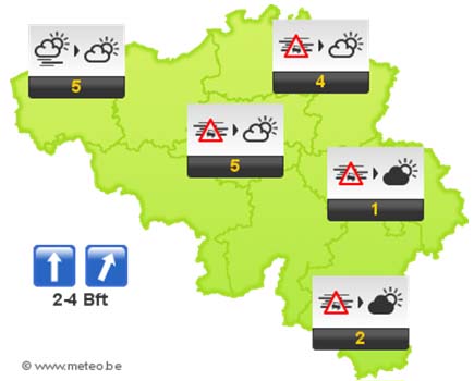Volgende nacht betrekt de hemel vanaf het westen. Rond middernacht bereikt een neerslagzone de kust en trekt geleidelijk landinwaarts. Aan zee verwachten we regen, in het binnenland smeltende sneeuw en regen. Minima tussen -2 en +3 graden bij een vrij krachtige zuidenwind.