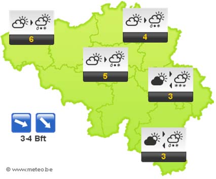 Vanavond en vannacht verschijnen er geleidelijk brede opklaringen en het wordt droger. In de Ardennen is er meer bewolking met kans op sneeuwbuien. De minima liggen tussen -2 en +3 graden. De wind waait zwak tot matig uit noordwest tot noord.