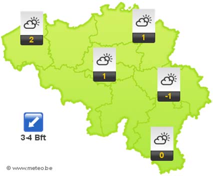 Vanavond en vannacht komen er geleidelijk brede opklaringen vanaf het noordoosten. Het wordt zeer koud, met minima van -3 graden in het westen tot -8 graden in de Hoge Venen. De wind blijft meestal matig waaien uit oost tot noordoost.
