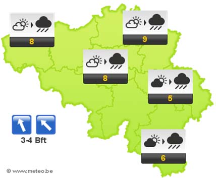 Vanavond trekt de regen weg naar het noorden. Er is kans op enkele buien, maar vannacht wordt het geleidelijk droog met meer opklaringen vanaf de Franse grens. Op veel plaatsen wordt nevel gevormd. De minima liggen tussen 1 en 3 graden. De wind waait matig uit zuid, ruimend naar zuidzuidwest.
