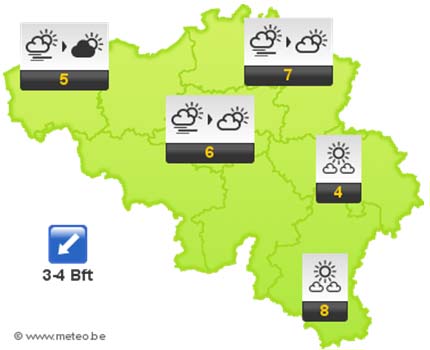 Het blijft het zo goed als droog met eerst grijs weer. In de loop van de dag kan de zon af en toe doorkomen en bezuiden Samber en Maas zijn brede opklaringen mogelijk. De maxima schommelen tussen 5 graden in het westen en 9 graden in het zuiden waar de zon schijnt.
