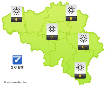 Vannacht wordt het op de meeste plaatsen geleidelijk aan bewolkt vanaf het noorden, behalve in het zuiden. Het blijft wel droog. De minima schommelen tussen -6 en 0 graden. De wind waait zwak, aan zee zwak tot matig, uit noordoostelijke richtingen.
