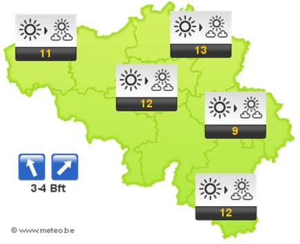 Vanavond en vannacht neemt de bewolking toe maar blijft het droog. Einde van de nachtvorst met minima van 2 tot 5 graden. De wind waait meestal matig, aan zee later mogelijk vrij krachtig, uit zuidwestelijke richtingen.