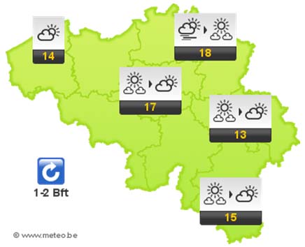 Vanavond neemt de bewolking geleidelijk toe vanuit het zuidwesten. Een zwakke storing trekt dan door het land en kan plaatselijk zorgen voor wat lichte neerslag. De minima liggen tussen 2 graden in de Ardennen en 8 graden aan de kust.