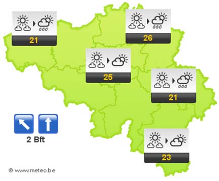 De volgende dagen blijft het warm en zonnig. 's Namiddags ontwikkelen zich wel stapelwolken, die tegen 's avonds zelfs voor een lokale onweersbui zouden kunnen zorgen. De maxima liggen tussen 25 en 27 graden in het centrum van het land, in de Kempen kan de temperatuur zelfs stijgen tot 28 graden. Door de zeebries wordt het aan de kust iets minder warm.