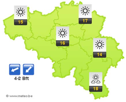 Vanavond en vannacht is het licht bewolkt tot helder. Het koelt sterk af met minima rond -1 graad in de Hoge Venen, +1 graad in de Kempen, +3 of 4 graden in het centrum van het land en van 5 tot 7 graden in de kuststreek. De wind wordt zwak tot plaatselijk matig uit noordoost. Op het eind van de nacht komt het op veel plaatsen tot vorst aan de grond!