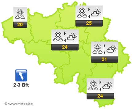 Tot zondag is het zonnig en warm met maxima van 22 tot plaatselijk 27 graden. Overdag ontstaan er tijdelijk stapelwolken maar het blijft droog. Zondag blijft het zeer warm en vrij mooi maar op het einde van de dag neemt de kans op buien toe vanaf de kust.