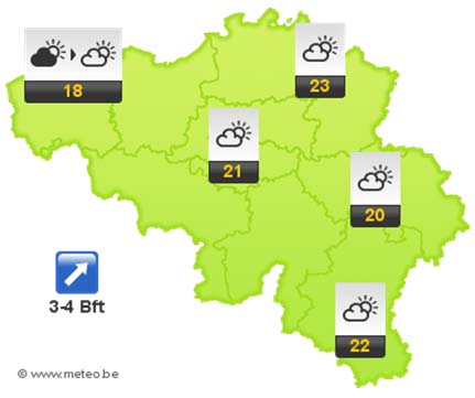 Vanavond en vannacht wisselen wolken en opklaringen elkaar af. In de loop van de nacht neemt de bewolking toe in het westen en in het tweede deel van de nacht is er kans op wat lichte regen in de kuststreek.