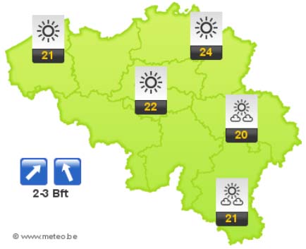Donderdag zijn er bewolkte perioden soms vergezeld van buien. Plaatselijk is daarbij een onweer niet uitgesloten. De maxima schommelen tussen 17 graden in het westen tot nog 21 graden in de Kempen. De westelijke tot zuidwestelijke wind waait vrij krachtig in het binnenland en krachtig aan de kust. Rukwinden later op de dag tot 50 à 60 km/h, in het uiterste westen zelfs tot zo'n 70 km/h .