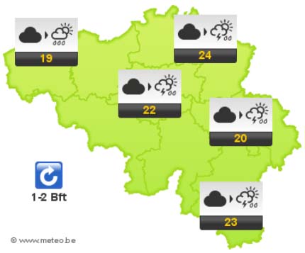 De maxima schommelen tussen 19 graden aan zee, 21 of 22 graden in het westen van het land en 24 graden in de Kempen. De wind waait eerst zwak uit veranderlijke richtingen maar wordt na doortocht van deze neerslagzone matig uit west tot noordwest.